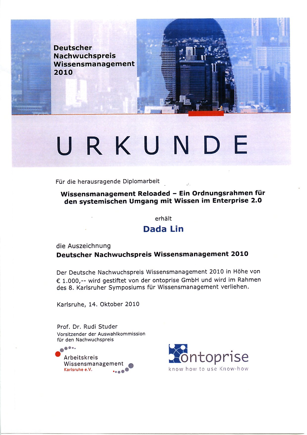 - w.i.i.m: Deutscher Nachwuchspreis Wissensmanagement 2010 für die Diplomarbeit von Herrn Dipl.-Wirt.-Ing. Lin. Technische Universität Dresden (Lehrstuhl für Wirtschaftsinformatik, insb. Informationsmanagement, Auszeichnungen der Professur), 16. Oktober 2012 Weiterlesen »
